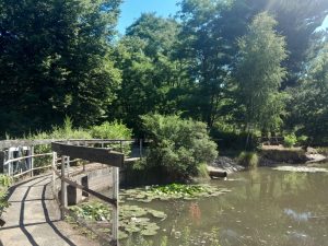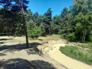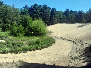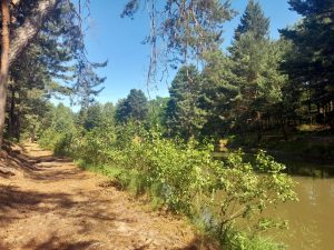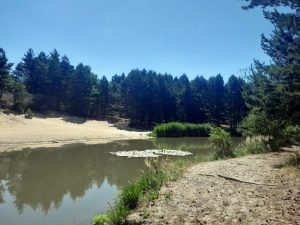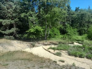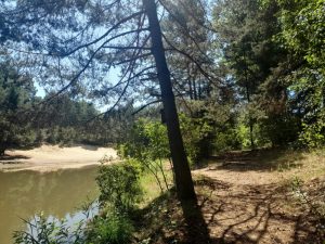 My swój spacer rozpoczęliśmy przy zalewie leśny dwór. Można również wyruszyć od strony parkingu przy ulicy Mostowej. Czerwony szlak jest dosyć dobrze oznakowany, ale warto włączyć sobie aplikację z mapą turystyczną. Teren jest leśny i mocno piaszczysty. Trzeba mieć to na uwadze przy wyborze obuwia.